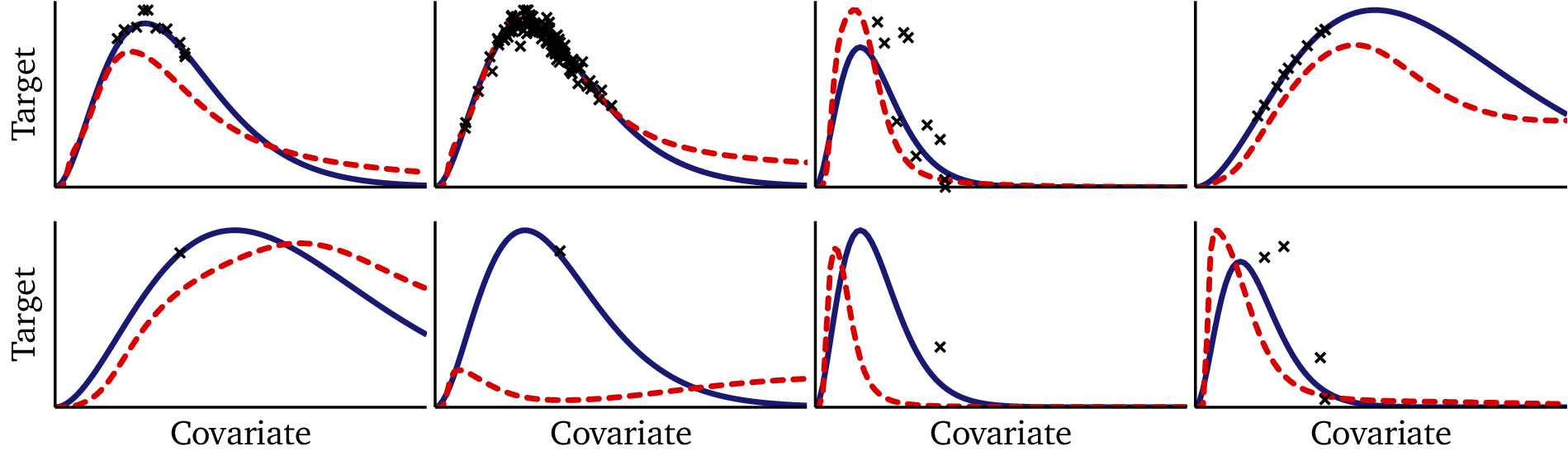 Despite these strengths, the hypernetwork approach is not perfect. When we evaluate predictions on out-of-sample datasets — datasets generated by the same process, but not included in the training data — we observe a noticeable degradation in quality, especially on noisy data, censored data, or on very small datasets, as the following examples show: