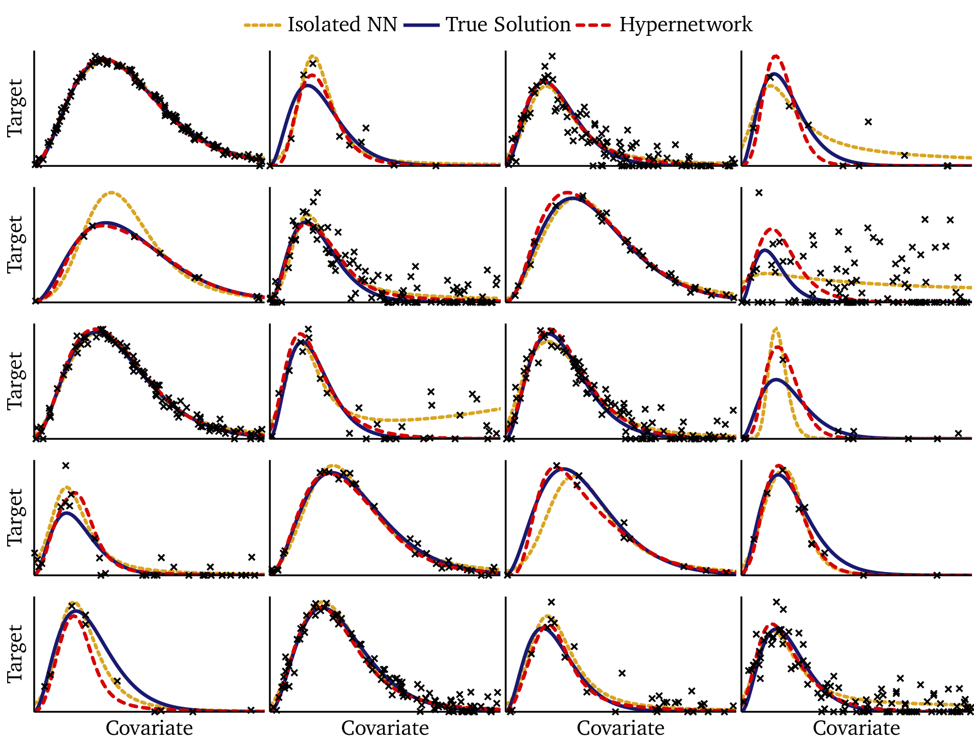 The next post in this series will explore Bayesian hierarchical models in detail, comparing their performance to the hypernetwork approach. As a teaser, the figure below shows Bayesian predictions on the same out-of-sample datasets we tested earlier: