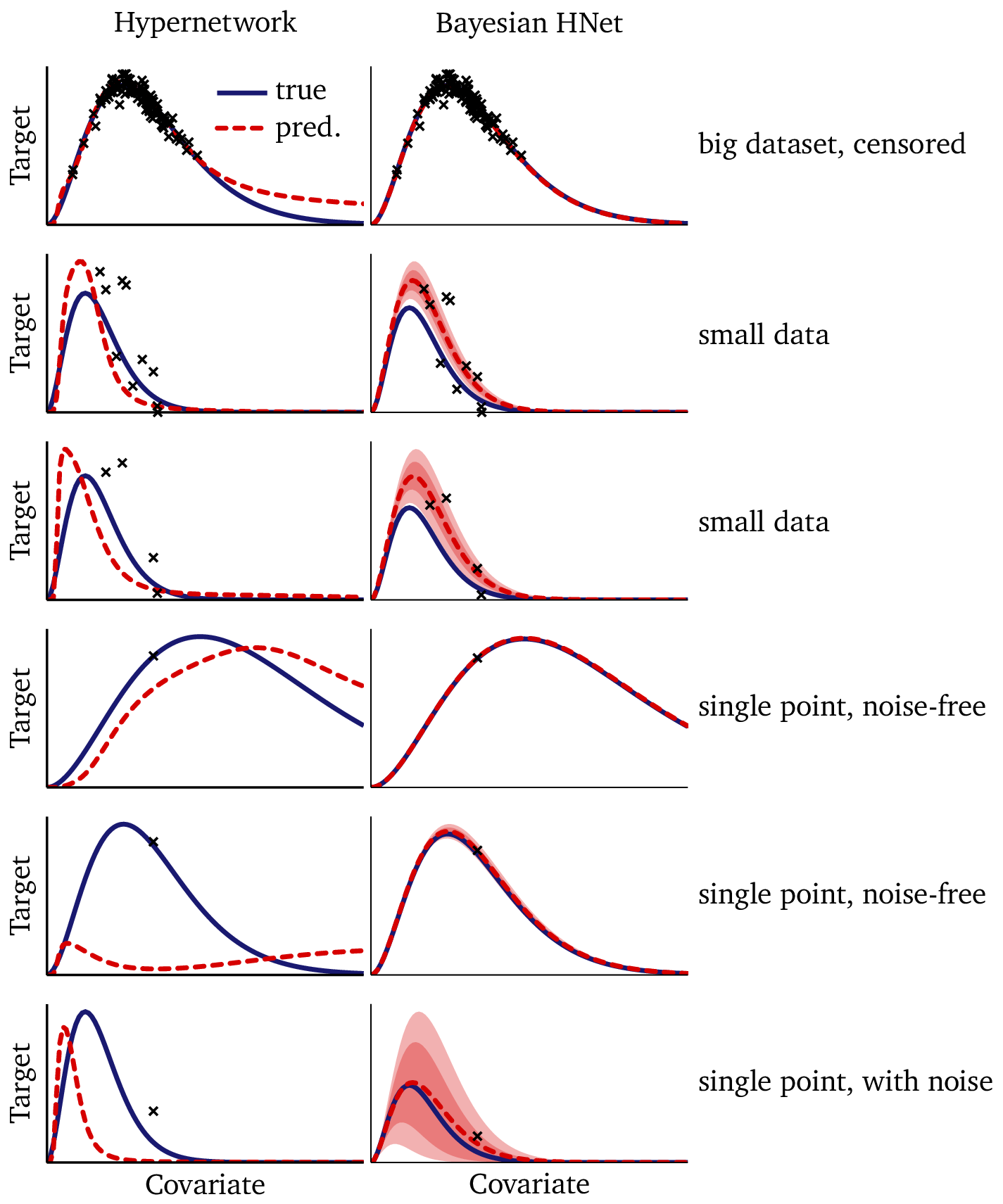 We see the hypernetwork perform admirably on the small datasets (2nd and 3rd rows), especially since a normal neural network cannot perform at all on out of sample datasets like these. At the same time, the improved stability and uncertainty quantification of the Bayesian model are also clearly evident.